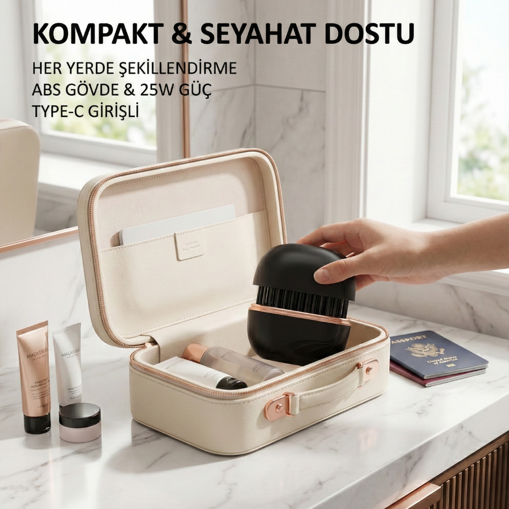Cebinize sığan mini tasarımı ve Type-C şarj girişi ile ofiste, seyahatte veya dışarıda hızlı rötuşlar için her zaman yanınızda; kapağını açın, cihazı çalıştırın ve saçınızı tarar gibi kolayca şekillendirin.